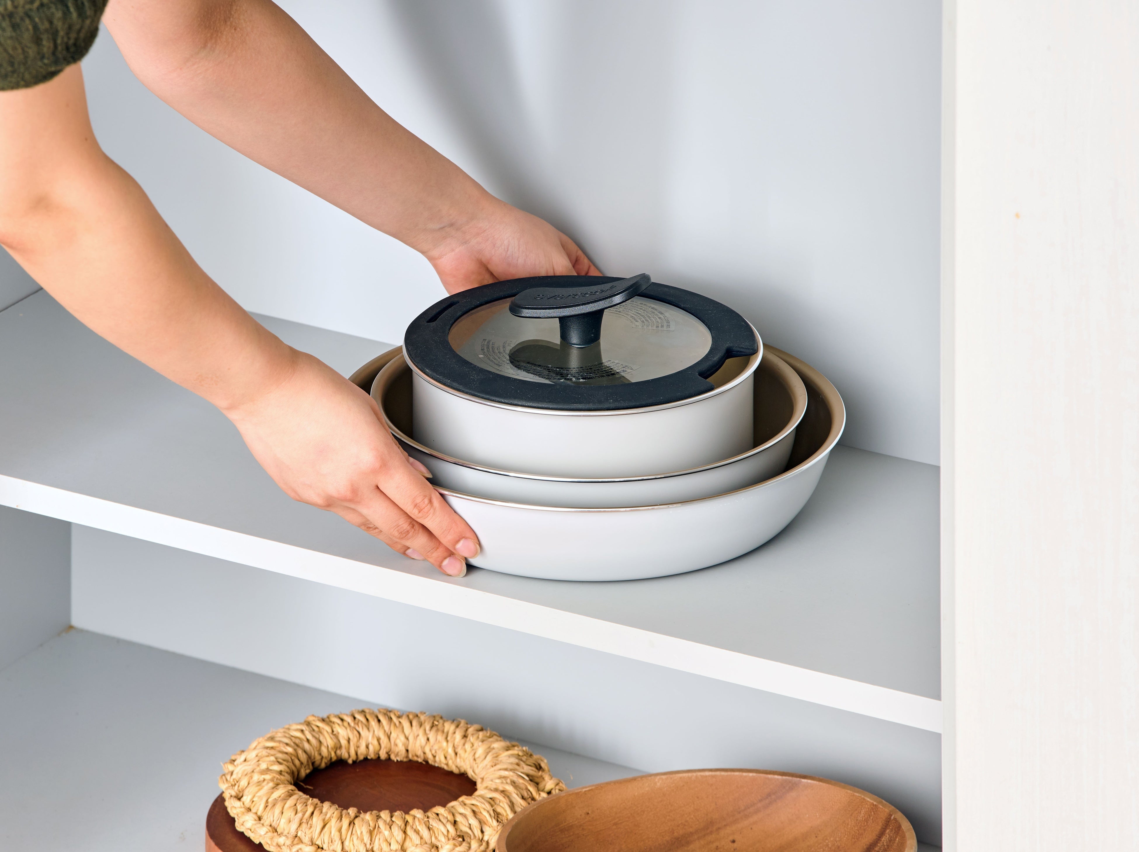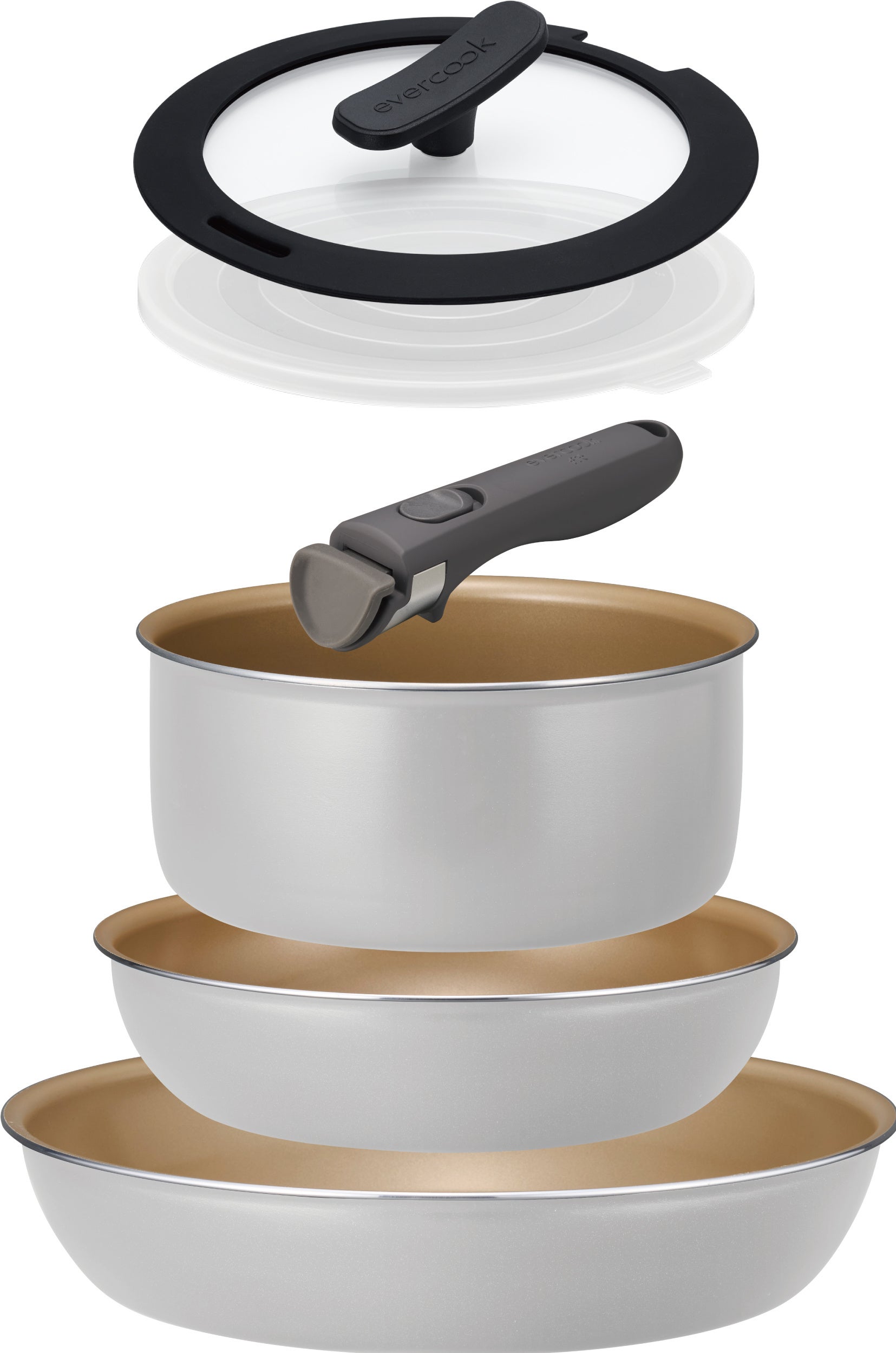 着脱式のフライパンセット。大・小フライパンとポット(鍋)の組み合わせで、このセットがあれば様々な料理が作れます。取っ手が取れるから、オーブン調理、食洗機使用、コンパクト収納が可能です。