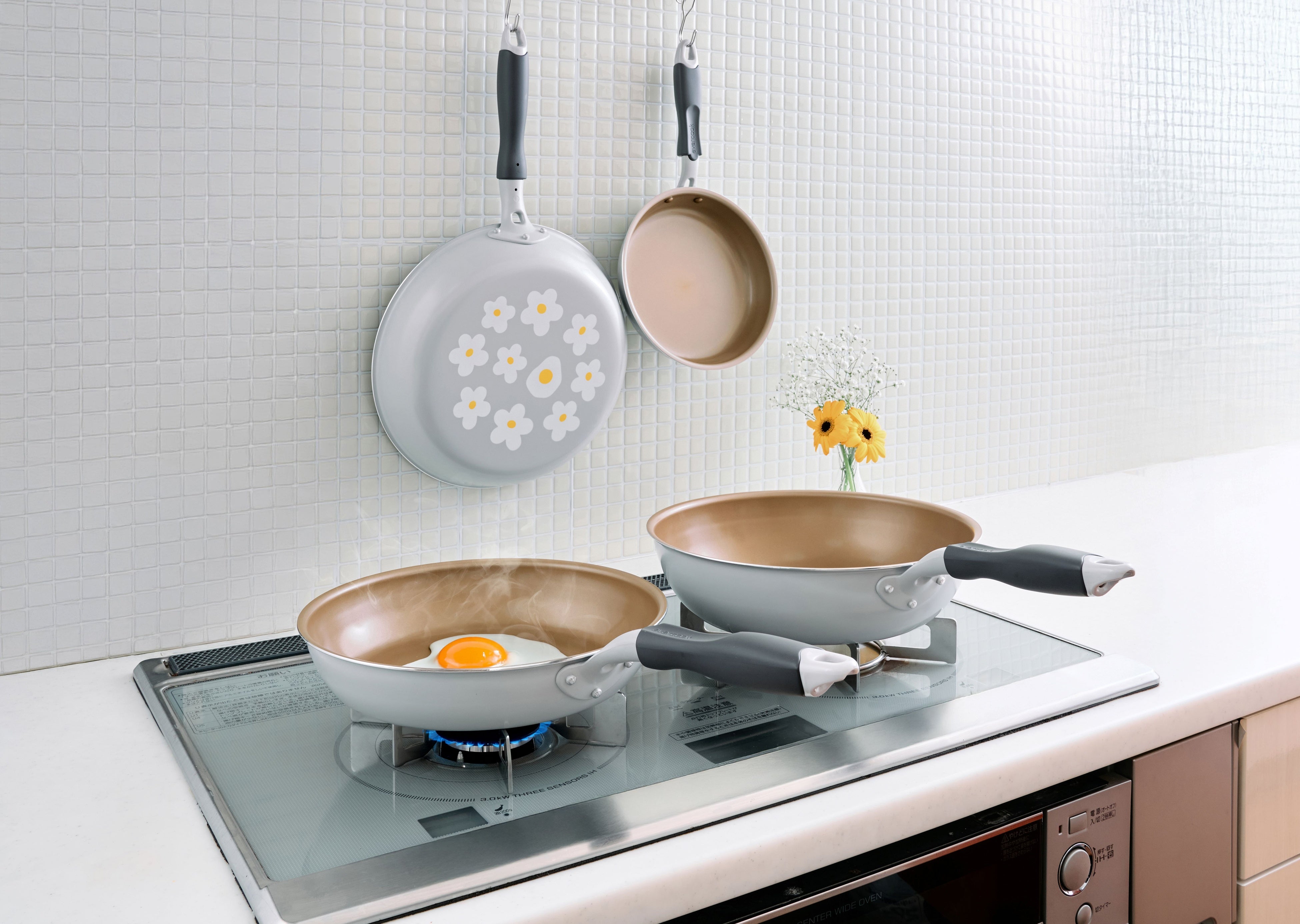 evercookのフライパンは「ツルすべの使い心地」が長持ちすることを大きな強みとしており、こびりつきにくさの象徴として「目玉焼き」をブランドアイコンとしています。本製品にも、お花に紛れて、目玉焼きがデザインされています。
