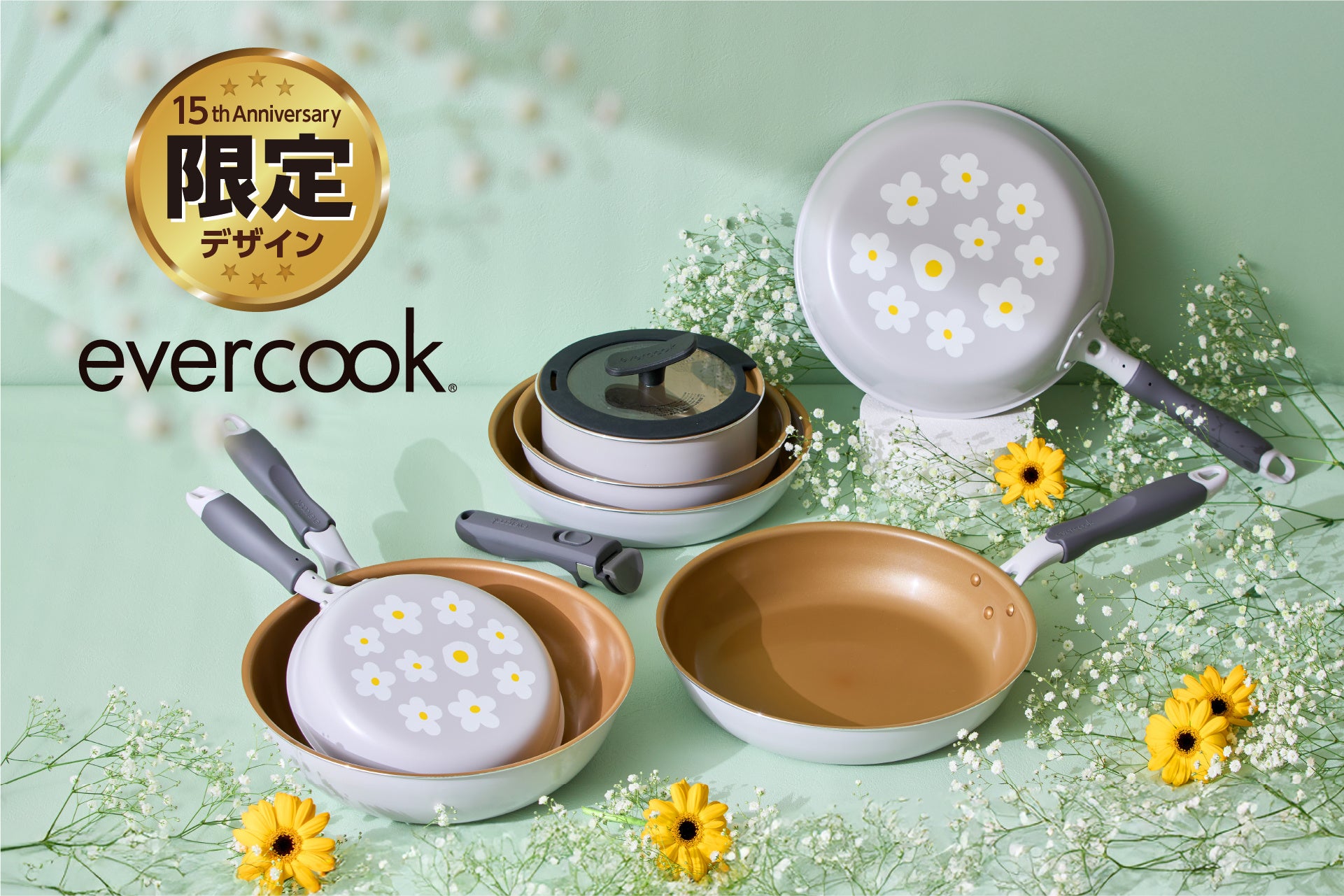 第一弾となる本製品は、15周年限定デザインのフライパンです。evercookのフライパンの中から人気のサイズやセットをセレクトし、白いお花をモチーフに北欧雑貨やナチュラルインテリアを思わせる、温かみのある雰囲気のフライパンに仕上げました。新生活に合わせてご自宅用のフライパンを新調するのはもちろん、贈り物にもおすすめの可愛らしいデザインです。