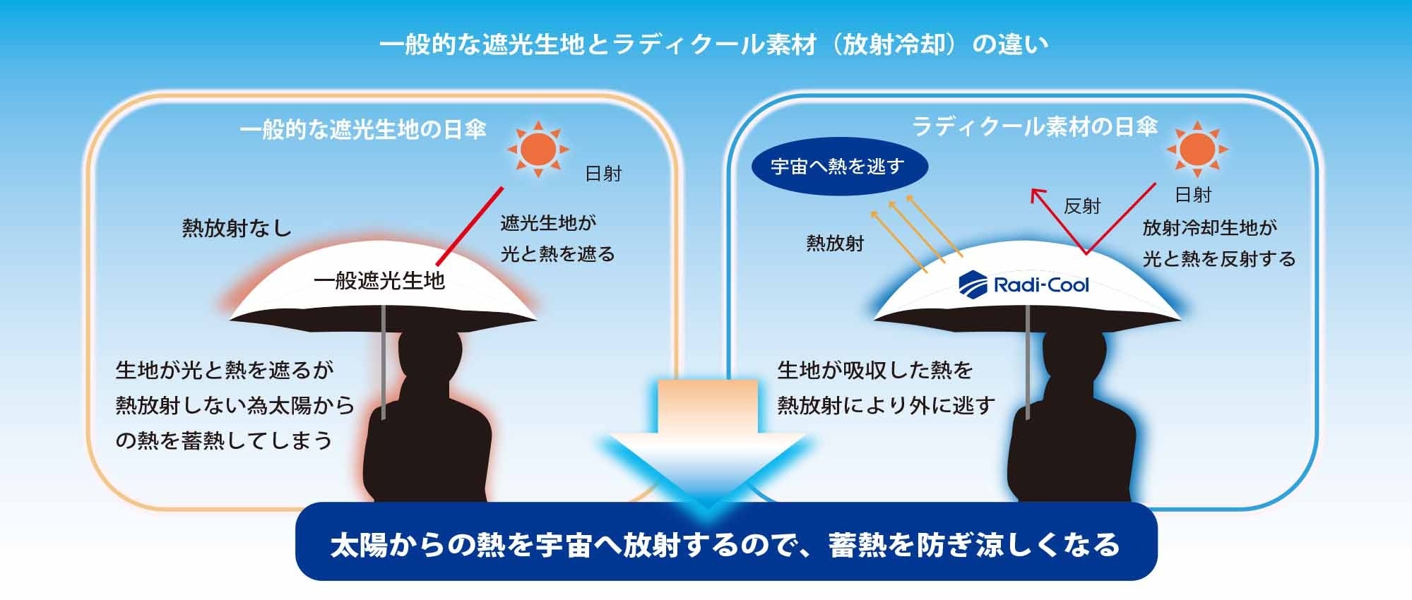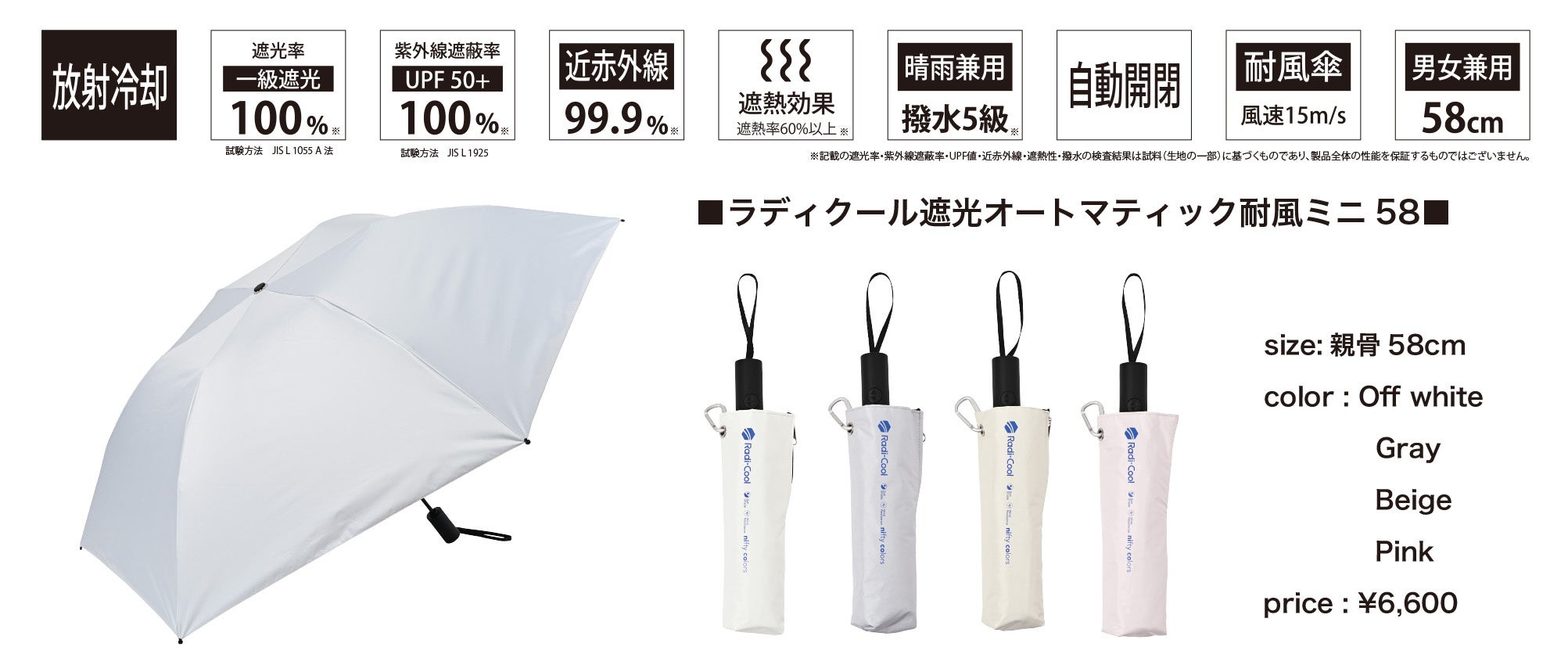 今回先行販売した**「遮光耐風自動開閉58」**は、放射冷却技術を応用した『Radi-Cool(ラディクール)』HCシリーズ生地を採用。