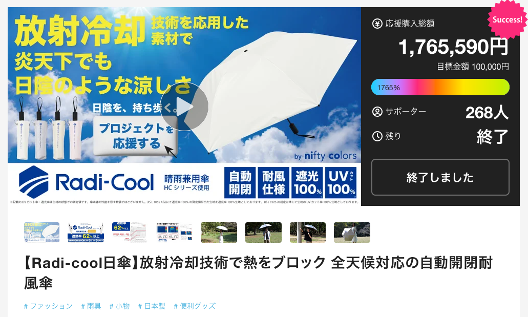 株式会社ニフティカラーズ(本社:東京都墨田区)は、クラウドファインディングサイドMakuake(マクアケ)にて『Radi-Cool(ラディクール)』HCシリーズ生地を使用した耐風自動開閉傘の先行販売を実施し、目標金額1,767%を達成したことをご報告いたします。今後の展開としましては、2月下旬頃より店頭、自社ECサイトにて販売を開始いたします。