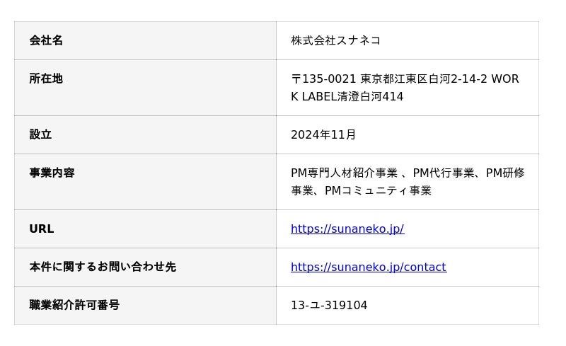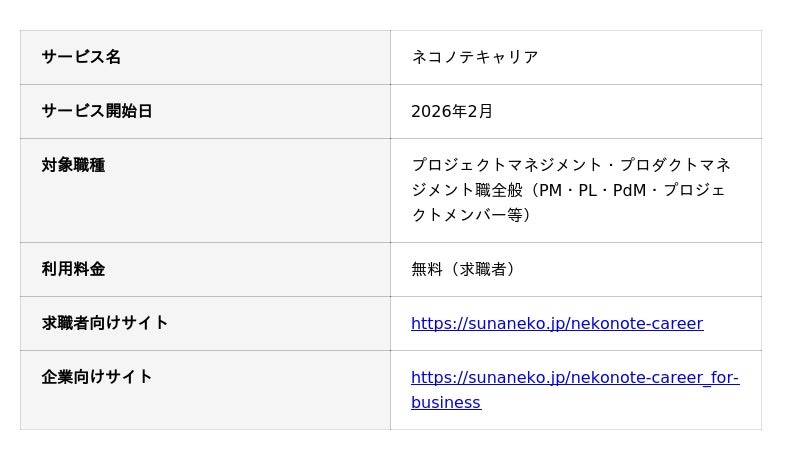 株式会社スナネコ(本社:東京都江東区)は、プロジェクトマネジメント・プロダクトマネジメント職に特化した転職エージェントサービス「ネコノテキャリア」を2026年2月より提供開始いたします。プロジェクトマネージャー(PM)やプロダクトマネージャー(PdM)に限らず、プロジェクトリーダー(PL)やプロジェクトメンバーとして活躍されている方も幅広く支援いたします。