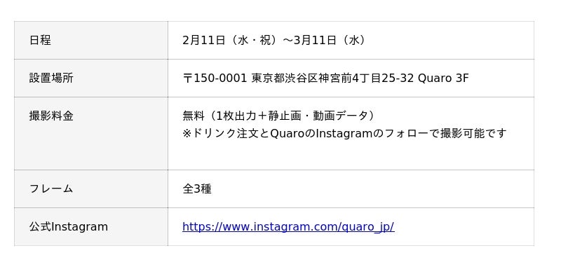 キタムラ・ホールディングス グループのピックハイブ株式会社(本社:東京都新宿区、代表取締役社長 兼 COO:大迫 由典)が運営するセルフフォトブランド「Photomatic(読み:フォトマティック)」は、2026年2月11日(水・祝)にグランドオープンするカフェ「Quaro(クアロ)」のオリジナルフレームで撮影できるセルフフォトブースを同店舗に期間限定で設置いたします。