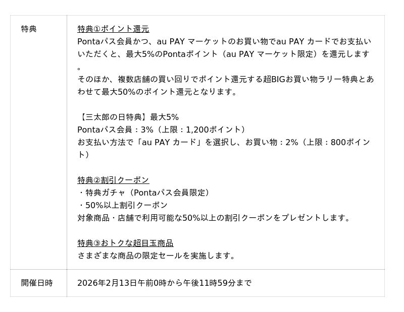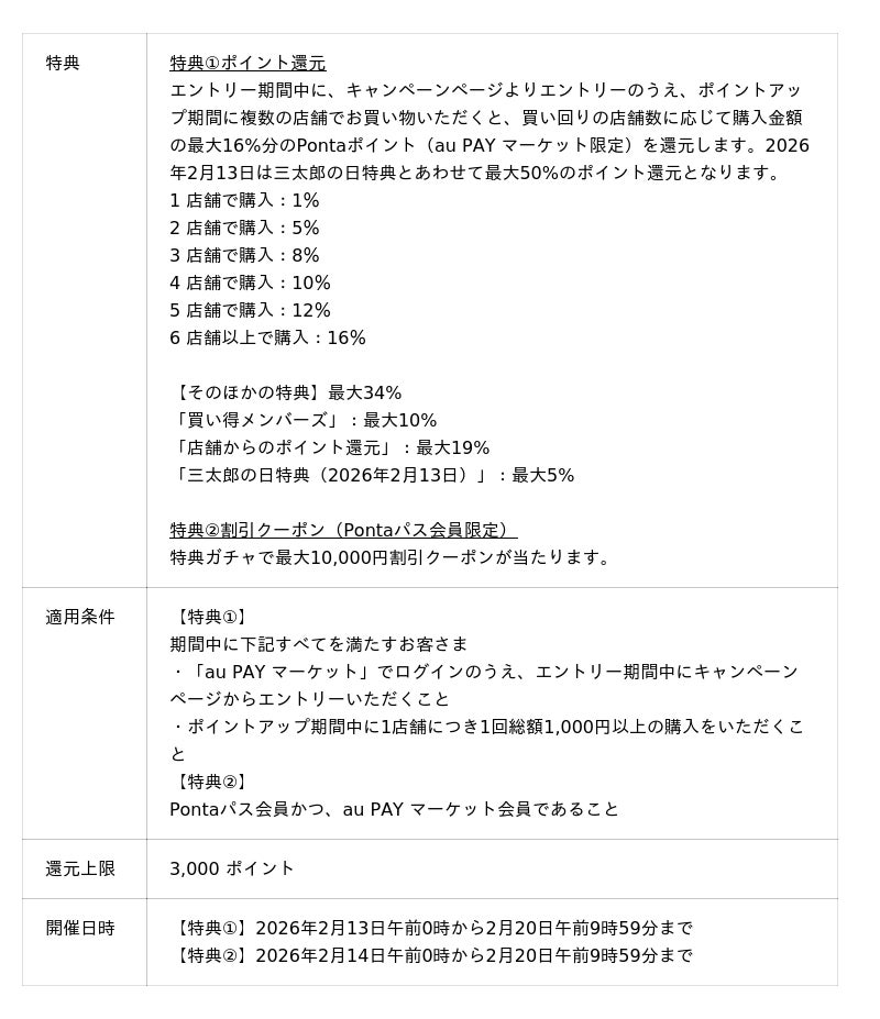 本キャンペーンでは、2店舗での購入で5%、6店舗以上の購入では16%のポイントを還元します。また、2026年2月13日は三太郎の日特典とあわせて最大50%のポイント還元に加えて、ハズレなしの特典ガチャ、50%以上割引クーポンの配布、超目玉商品セールを実施し、おトクにお買い物をお楽しみいただけます。