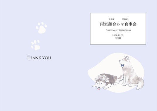 ふわっとした毛並みと、どこか優しい表情のハスキーを描いたデザイン。そっと寄り添う姿からは、これからの日々を共に歩むおふたりの、穏やかであたたかな時間が感じられます。