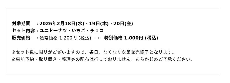 グランドオープンに先駆け、2月16日(月)・17日(火)の2日間、自慢の味を一足早くお届けするプレオープン営業の実施が決定!さらに、2月18日(水)・19日(木)・20日(金)の3日間は、オープンを記念して「ユニドーナツ・いちご・チョコ」の人気フレーバー3種セットを、特別価格でご提供いたします。