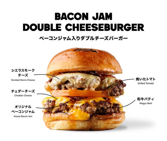 SHOGUN BURGER自慢のジューシーな和牛に、とろけるチェダーチーズをのせたパテと、香りとコクが上品なシエラスモークチーズをのせたパテの2枚を重ねた特別なダブルチーズバーガー。