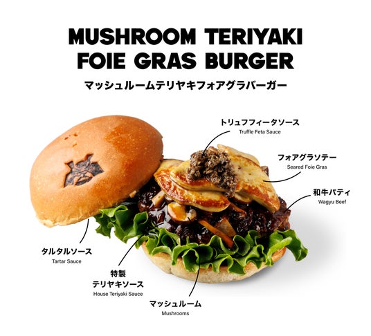 ジューシーな和牛パテに、香ばしくコク深い特製テリヤキソースで炒めたゴロゴロマッシュルームを重ね、その上にとろりと甘いフォアグラソテーを贅沢にオン。