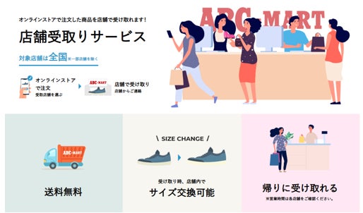 ABCマートではECサイトの商品をECサイトで購入後、店舗でご試着してお受取が可能な店舗受取サービスをご用意しております。サイズが合わない場合はサイズ交換やキャンセルも可能で安心してお買い物を楽しんでいただけます。