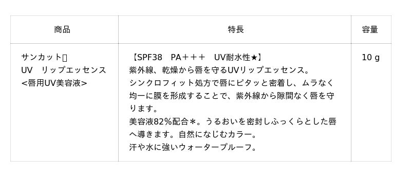 このような背景を受け、人気日やけ止めブランド『サンカット(R)』から、待望のUVリップエッセンスを発売します。KOSEの優れた技術力で高いUVカット効果を実現。美容液を82%*配合し、紫外線を隙間なく防ぎながら、くすみ※1知らずのうるおいあふれる唇を叶えます。