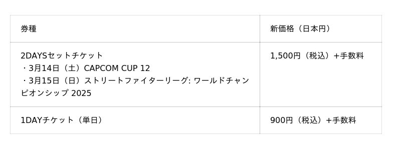 「CAPCOM CUP 12」および「ストリートファイターリーグ: ワールドチャンピオンシップ 2025」(以下:本大会)のライブ視聴チケットの新価格についてご案内いたします。