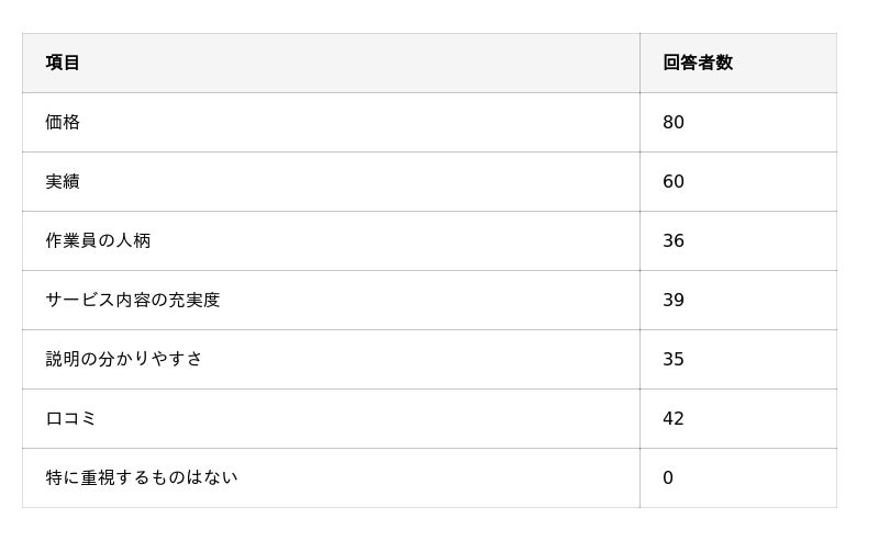 – エアコンクリーニングの比較検討時に重視されているのは「価格」と「作業実績」。