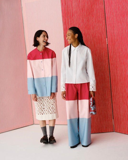 本コレクションは、1967年にアンニカ・リマラ(Annika Rimala)がデザインした装飾的なケイダス(Keidas)を、シャツのエレガントなトリムに刺繍レースとして、またパンツやドレス、スカートの主要なモチーフとしても取り入れています。装飾的なケイダスの対比として、ヴォッコ・エスコリン=ヌルメスニエミ(Vuokko Eskolin-Nurmesniemi)による建築的なストライプ、ヘンニカ(Hennika)がコレクションを彩ります。