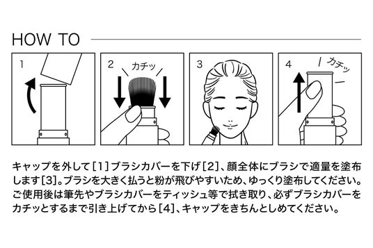 使い始めや粉が出にくいときは、ティッシュ等にブラシをトントンと当て、筆先にパウダーを含ませてください。