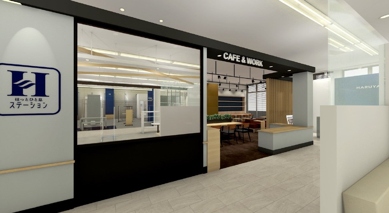 『ほっとひと息ステーション』は、当店をご利用いただくビジネスパーソンをはじめとする地域住民の方に『モノ』であるウェアの提供だけでなく、快適にお過ごしいただける空間として『コト』のサービスをご提案する場として誕生しました。はるやまが、周辺地域の方々にとって憩いの場となり、お客様が“もっと便利、もっと快適”に当店をご利用いただけるようカフェスペースやファイテンボディリフレッシュカプセルをはじめとした様々なサービスを提供しています。