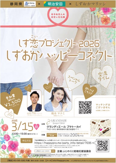県と市町が運営する公的な結婚支援拠点「しずおかマリッジ」では、明治安田生命保険相互会社と連携し、結婚を希望する若手社会人の出会いを応援する「しず恋(こい)プロジェクトを展開しています。