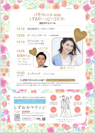 県と市町が運営する公的な結婚支援拠点「しずおかマリッジ」では、明治安田生命保険相互会社と連携し、結婚を希望する若手社会人の出会いを応援する「しず恋(こい)プロジェクトを展開しています。