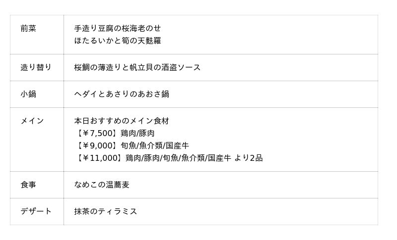 メイン料理を数種類の食材の中からお選びいただける「四季彩コース」は、旬の食材の美味しさを料理長ならではの調理法でお楽しみいただけます。前菜では、ごま油の芳醇な香りで味付けした桜海老を乗せた手造り豆腐と、旬のほたるいかと筍の天麩羅をご用意。造り替りは、お祝いの席にも適した縁起の良い桜鯛の薄造りと、帆立貝を酒盗のソースで和風カルパッチョ風に仕上げたお酒によく合う一品です。小鍋はヘダイとあさりの旨みをあっさりとしたあご出汁で引き出し、あおさの磯の香りが優しく広がる春らしい鍋に仕上げました。