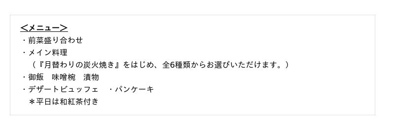 食後のデザートは、小菓子、ゼリー、焼き菓子などのパティシエ特製デザートを6種類ビュッフェ台に並びます。食べやすいサイズでお好きなだけお取りいただけますので、心ゆくまでご堪能ください。また、鉄板で仕上げる旬香自慢のふわふわな出来立てパンケーキもお楽しみいただけます。