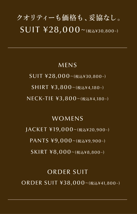 大切な仲間たちに対して、いつも正直でありたい。その想いは、お客様に対する製品の価格設定においても徹底してきました。すべては「 ほかにない、ONLY だけの確かなスーツ」をつくりつづけるために。