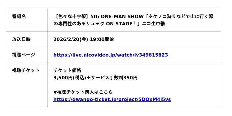 色々な十字架の記念すべき5周年ワンマンライブ「タケノコ狩りなどで山に行く際の専門性のあるリュック ON STAGE!」の完売を受け、ニコニコ生放送で独占ライブ中継が決定。2/20(金)19時~放送予定