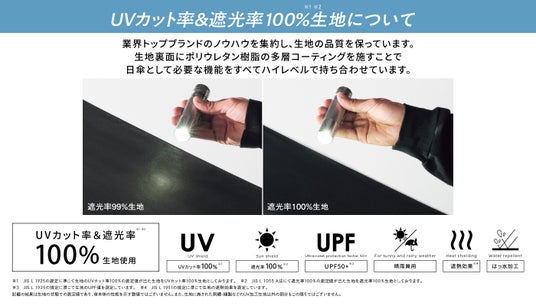 *JIS L 1925の規定に準じて生地のUVカット率100%の測定値が出た生地をUVカット率100%生地としております。JIS L 1055 A法にて遮光率100%の測定値が出た生地を遮光率100%生地としております。JIS L 1925の規定に準じて生地のUPF値を測定しています。