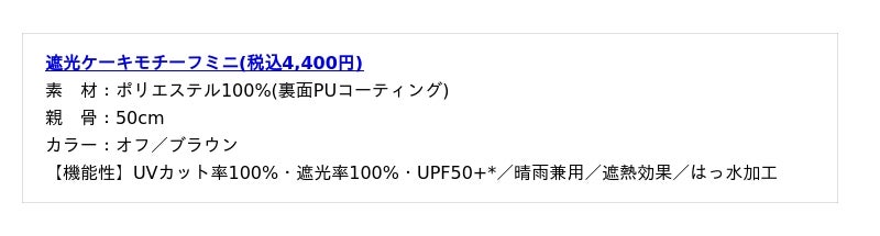 ※記載の結果は生地の状態での測定値であり、傘本体の性能を示す数値ではございません。また、生地に施された刺繍・縫製などのUV加工生地以外の部分もこの限りではございません。