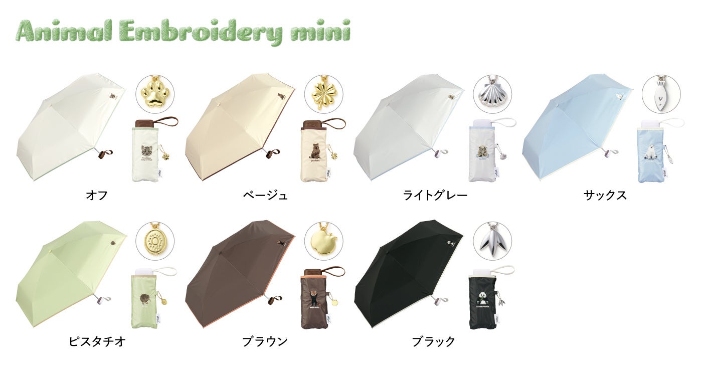 また、”好きになることが最初の一歩“がテーマの『遮光アニマル刺繍ミニ』は、ラッコやキーウィ、ジャイアントパンダなど全7種の絶滅危惧種を傘ケースと本体に刺繍。生物たちが置かれている状況に目を向け、未来や環境について考えるきっかけになれば、というメッセージを込めた日傘です。