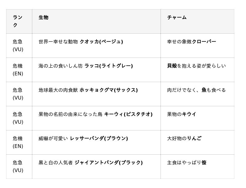 今回、Wpc.では”絶滅危惧種”に指定されている7種の生物をモチーフにした日傘をつくり、それぞれの生物にちなんだチャームを付けました。彼らのことを知って、好きになることが最初の一歩になる。この日傘を使うことで、環境や生物の未来を考えるきっかけになればと思います。