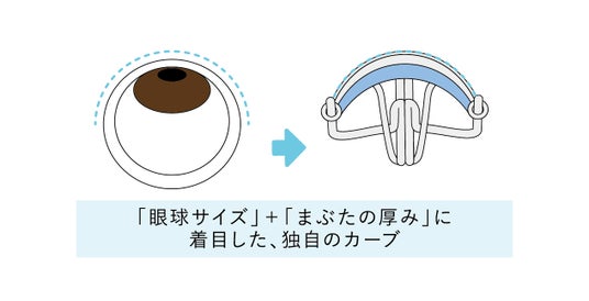 – 千差万別な「まぶたのカーブ」ではなく、「眼球サイズ」+「まぶたの厚み」に着目した、独自のカーブを採用。ひとえ・奥ぶたえのまぶたにぴったりフィットします。