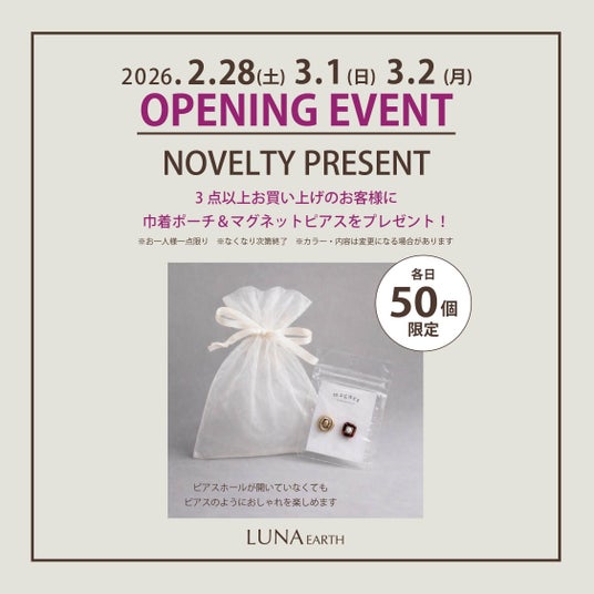 商品を3点以上お買い上げのお客様に、巾着ポーチ&マグネットピアスのセットをプレゼントいたします。