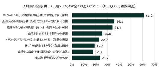 肝機能の認知については、「アルコールや薬などの有害物質を分解して無害化する(解毒)」が最も多く、その一方で、アルコール分解以外の役割(代謝や免疫、胆汁の生成・分泌、栄養の貯蔵等)の認知に関してはいずれも4割以下に留まり、「特に思い浮かばない/わからない」と回答した人も2割を超える結果となりました。