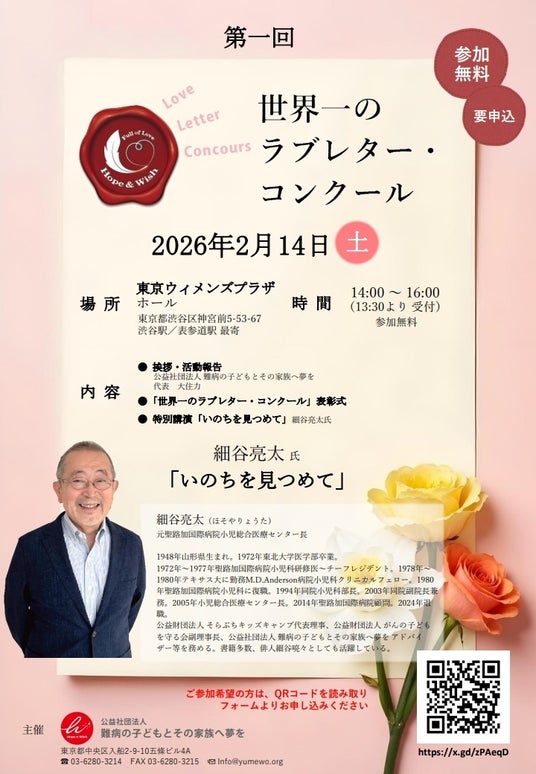 公益社団法人 難病の子どもとその家族へ夢を(所在地:東京都中央区、代表理事:大住力)は、2026年2月14日(土)、東京ウィメンズプラザ ホールにて、「第1回 世界一のラブレター・コンクール」表彰式および記念イベントを開催いたしました。多数の来場者が参加し、会場は温かな拍手に包まれました。