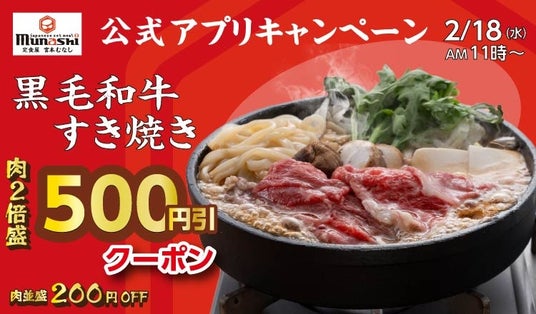 本キャンペーンでは「黒毛和牛のすき焼き定食」を200円引き、「黒毛和牛のすき焼き定食 肉2倍盛り」を500円引きのクーポンを宮本むなし公式アプリで配信いたします。
