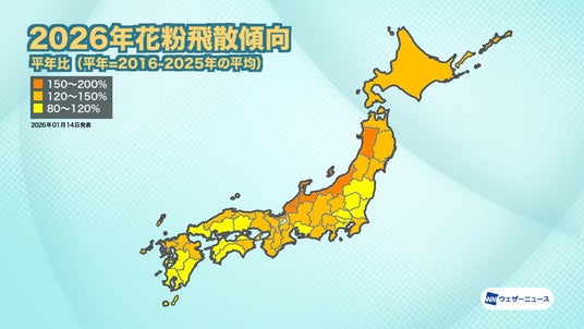 「平年(2016~2025年の平均飛散量)比ではほぼ全国的に平年の飛散量を上回り、特に東北北部や北陸では150%を超えるエリアがあります。全国平均では128%となる予想です。」