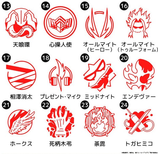 エンブレムのデザインは、緑谷出久や爆豪勝己、麗日お茶子、轟焦凍に、オールマイト、相澤消太、エンデヴァー、ホークス、死柄木弔や荼毘、トガヒミコなど24種類。マークをみればそのキャラクターが彷彿とされるようなデザインとなっています。