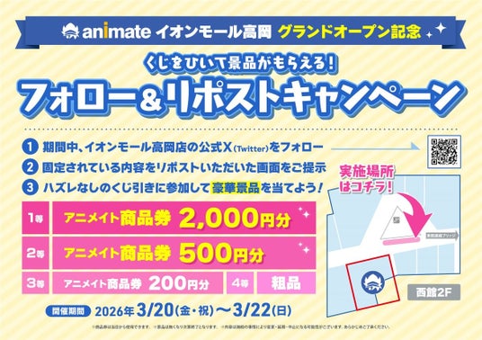 株式会社アニメイトは、2026年3月20日(金・祝)にグランドオープン予定の「アニメイトイオンモール高岡」で開催する、オープン記念キャンペーンの概要を発表いたしました。