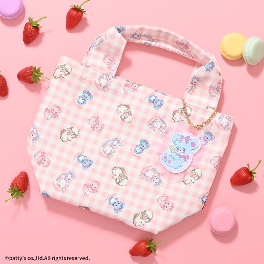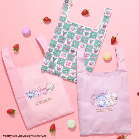 キャミー・ハグリー・リバニー・ラッフィーとカップケーキの総柄で、持つだけで気分が上がるデザイン。『SWIMMER』ロゴ入りハートチャームがアクセント♪