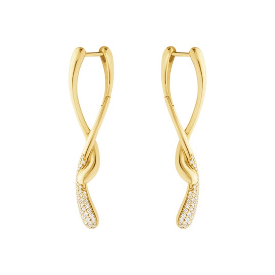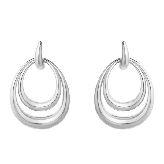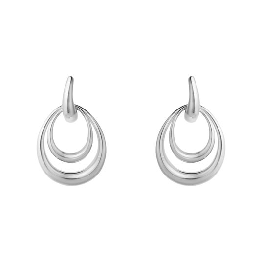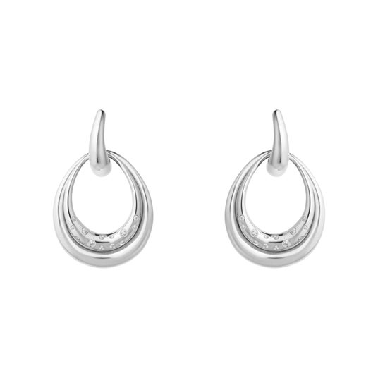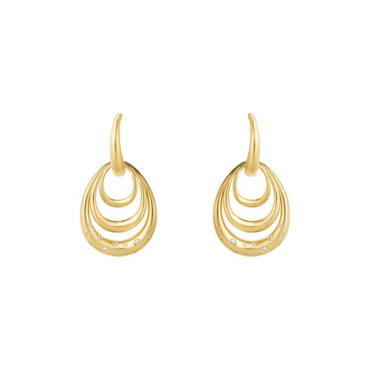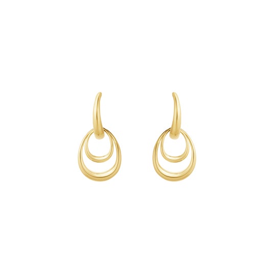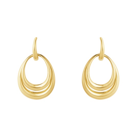 中央のフープに取り外し可能なサイズ違いのドロップ型モチーフがあしらわれており、重ね付けでも単体でも楽しめるデザインで、どんな表情にもフィットします。