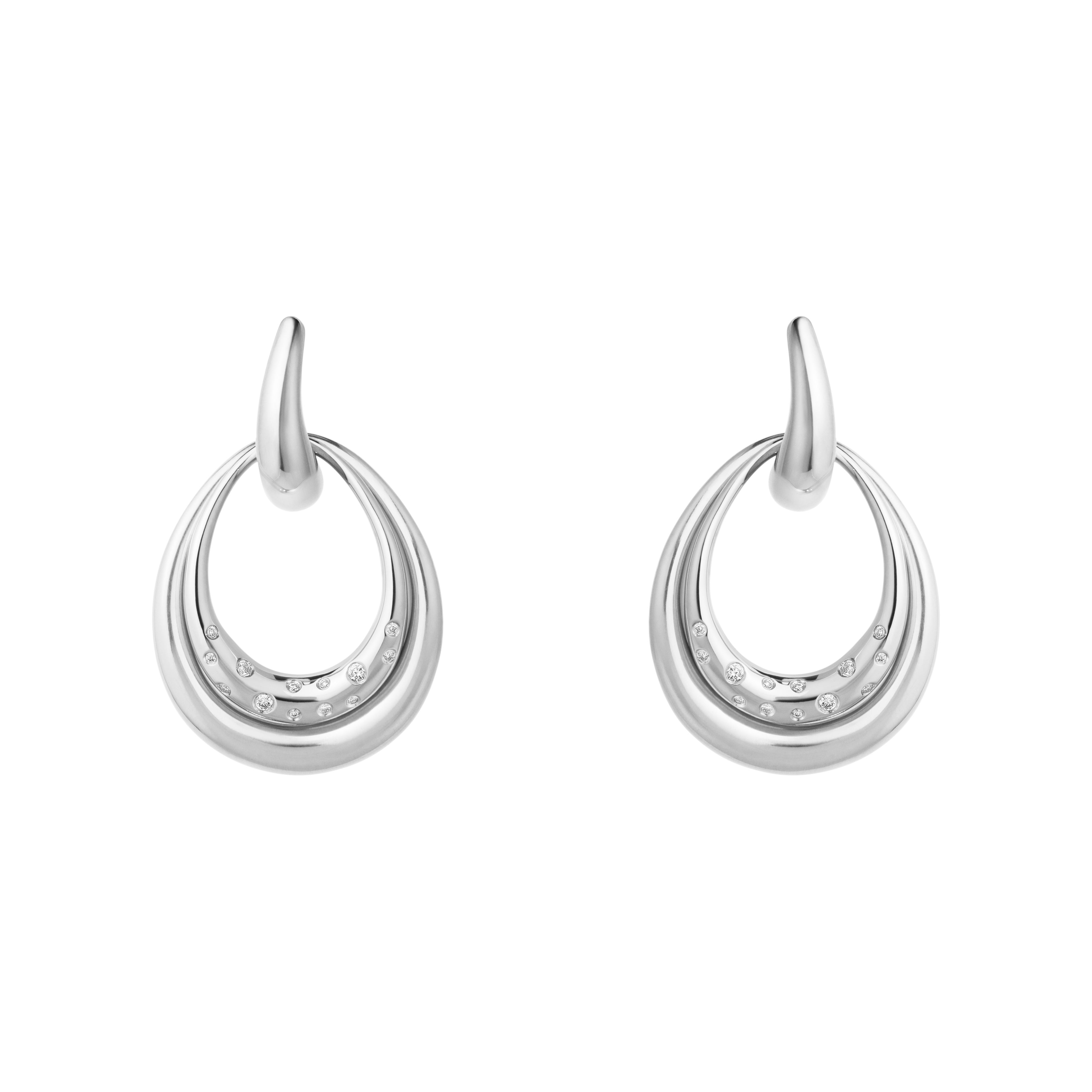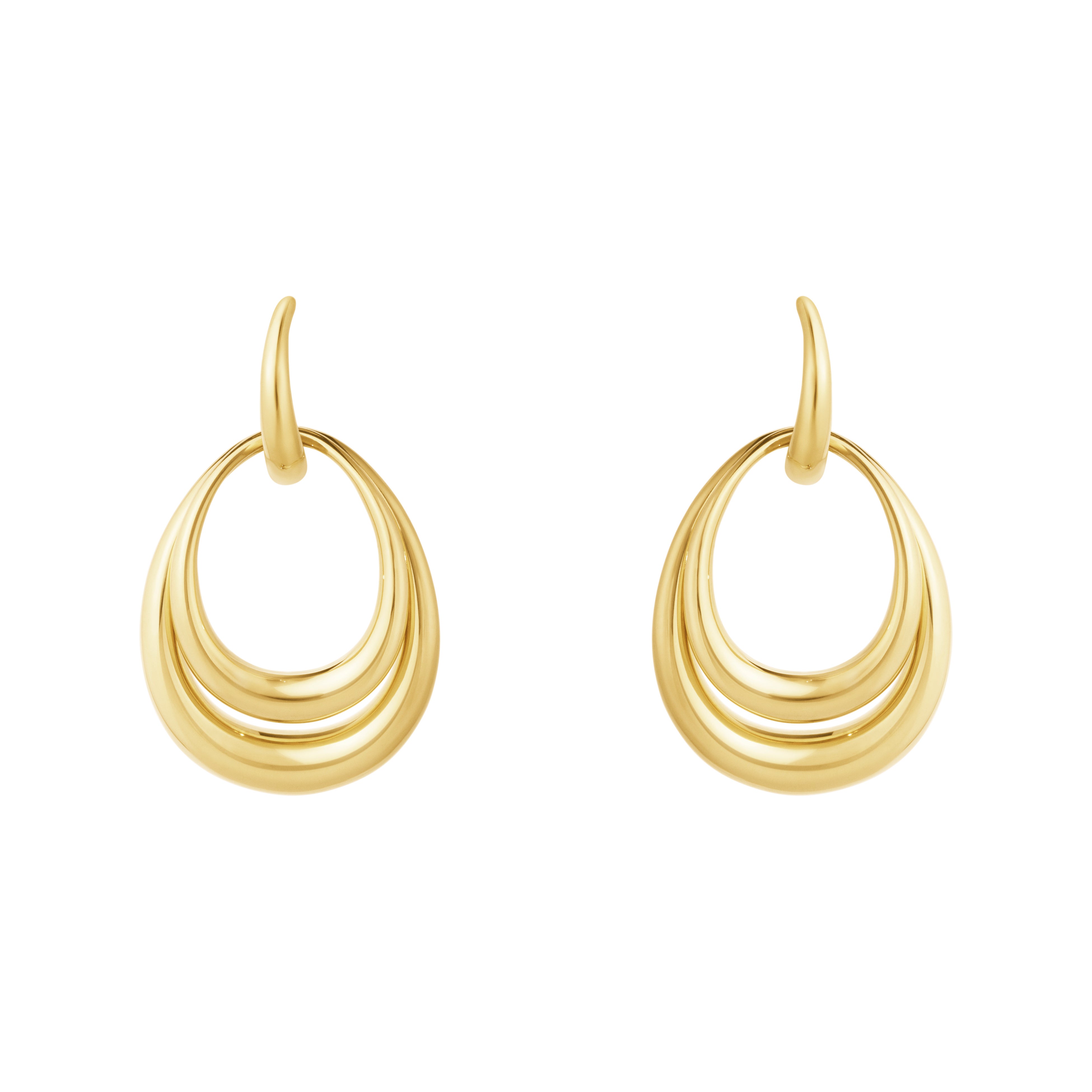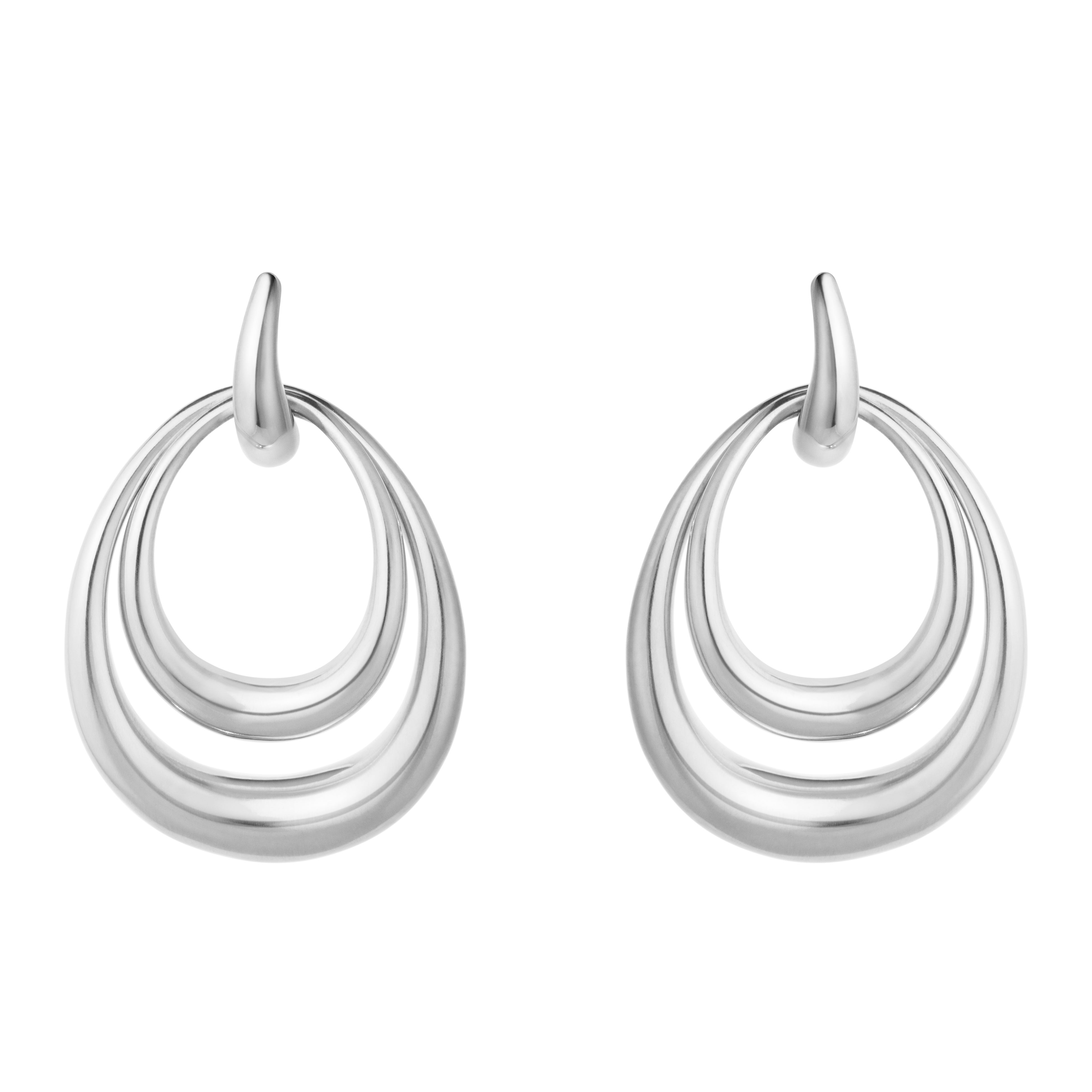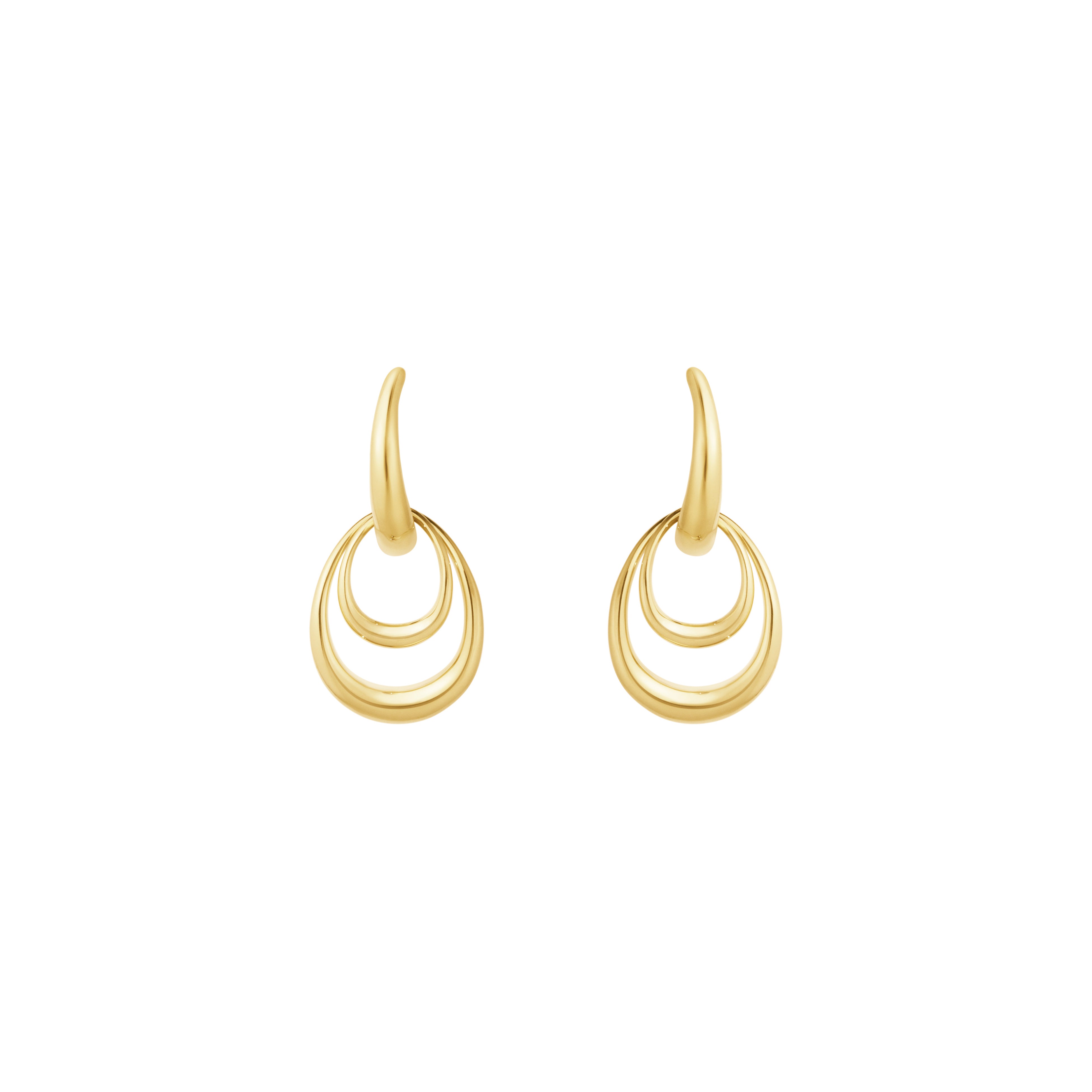 中央のフープに取り外し可能なサイズ違いのドロップ型モチーフがあしらわれており、重ね付けでも単体でも楽しめるデザインで、どんな表情にもフィットします。