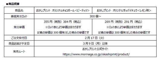 森永製菓株式会社(東京都港区芝浦、代表取締役社長 COO・森 信也)は、オリジナルデザインお菓子制作サービス「おかしプリント」の対象商品に、2月17日(火)より「おかしプリント オリジナルチョコボール<ピーナッツ>」「おかしプリント オリジナルすッパイチュウ<レモン味>」を追加し、ラインアップの拡充をいたします。