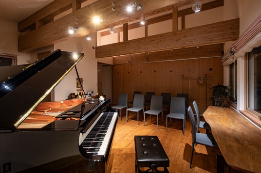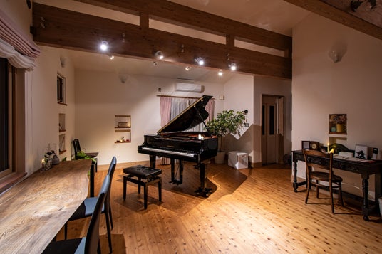 グランドピアノ常設の吹き抜けの空間で、地域の表現活動を支援。小規模でも質の高い音楽体験を実現。