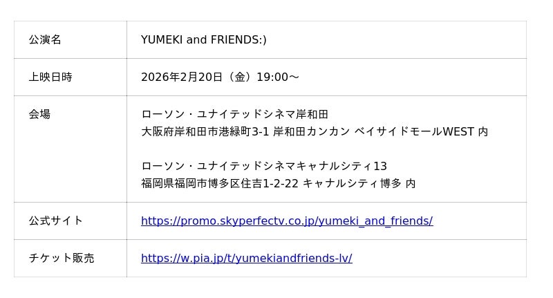 ぴあアリーナMM(神奈川県)で開催されるYUMEKIのファンミーティング「YUMEKI and FRIENDS:)」(主催:スカパーJSAT株式会社)を大阪と福岡の二つの映画館で鑑賞できるライブビューイングです。2K、ステレオでの上映というODSの標準的な規格でありながらも、JUUQXによる高画質・ロスレス音声伝送を採用することで質の高いパフォーマンスを余すところなくシアターまで届け、映画館の優れた上映設備を最大限に活かした高品位な音響・映像体験を提供します。