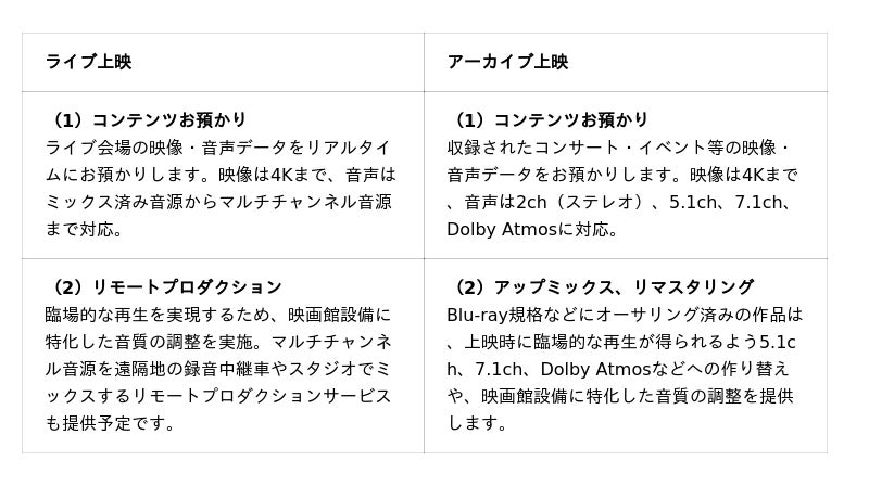 ロスレス・ハイレゾ音声のマルチチャンネルに対応し、ODSの主流だったステレオ(2ch)に加えサラウンドオーディオ(5.1chや7.1ch)、イマーシブオーディオ(Dolby Atmos)の配信が可能です。また、ステレオ音源をサラウンドやイマーシブへ作り替えるアップミックスや、映画館という上映環境に特化した音質の作りこみを行うリマスタリングサービスも提供します。