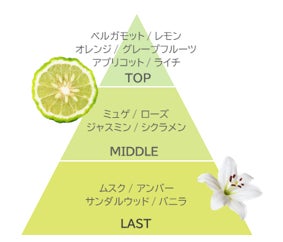 レモンやベルガモットの爽やかなシトラスに、甘いアプリコットや華やかなフローラルを合わせた柔らかな香り。ムスクやバニラを加えることで、香りに清潔感とやさしさを持たせました。