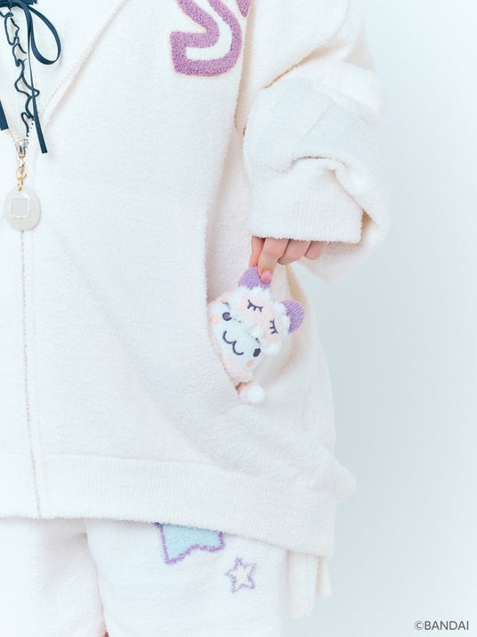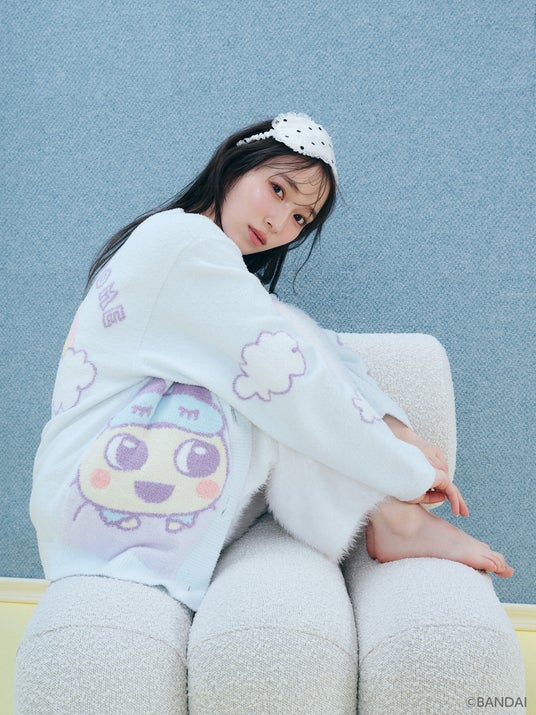 ルームウェアを纏ったたまごっち達の絵柄が愛らしいカーディガン。