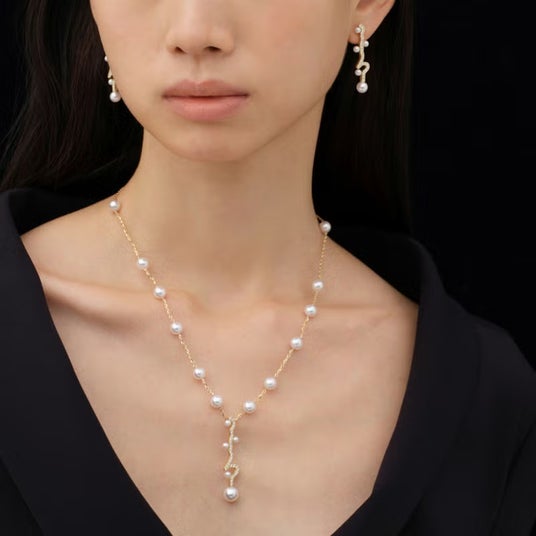 角度によって多彩な表情が浮かび上がるアコヤ真珠の光沢とダイヤモンドの輝きが共鳴し合い、纏う人の内面や想いを映し出すかのようなデザインに仕上がっています。