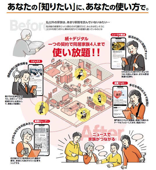 家でじっくり新聞を読むのが好きな方も、通勤・通学中にスマホでサッとニュースをチェックしたい方も、気になるニュースを関連記事からとことん深掘りしたい方も、記事の「音声読み上げ」などデジタル版ならではの機能を便利に使ってみたい方も、家族それぞれにぴったりの読み方で朝日新聞をお楽しみいただけます。