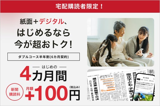 株式会社朝日新聞社(代表取締役社長CEO:角田克)は、2026年2月17日(火)~2026年4月9日(木)、朝日新聞(宅配)を購読中の方限定のデジタル版「ダブルコース半年割」を初めてお申し込みいただいた方を対象に、通常月額500円+新聞購読料が、ウェブ申し込み限定ではじめの4カ月間月額100円でご利用いただけるキャンペーンを実施します。このお得な機会にデジタルデビューしてみませんか。