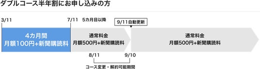 「ダブルコース半年割」は新聞購読料に月額+500円(税込み)の6カ月契約で、同居の家族4人まで、デジタル版が使い放題になる新聞購読者限定のお得なコースです。